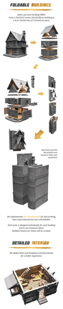 The buildings in this collection are foldable and can be put in our tomes so you can get them tagged and organized, downsize the space they occuppy, make them readily available by theme ex. humans, elves, pireates etc., and if you are a merchant, you can ship them easily and secured.
